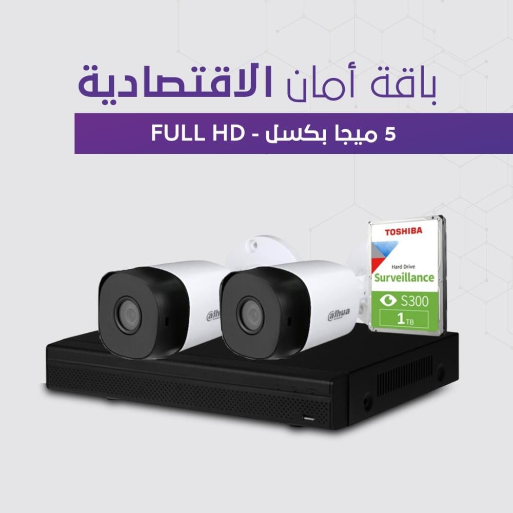 - كاميرتين خارجية بدقة 5 ميجا بكسل بصورة عامة FULLHD 1080P مقاومة للعوامل البيئية بخاصية الرؤية الليلية SMART IR (هي خاصية تعمل عند انقطاع الضوء في المكان, وتكشف المكان على مدى 20 متر. (يمكنك إضافة عدد الكاميرات من الخيارات بالأسفل)